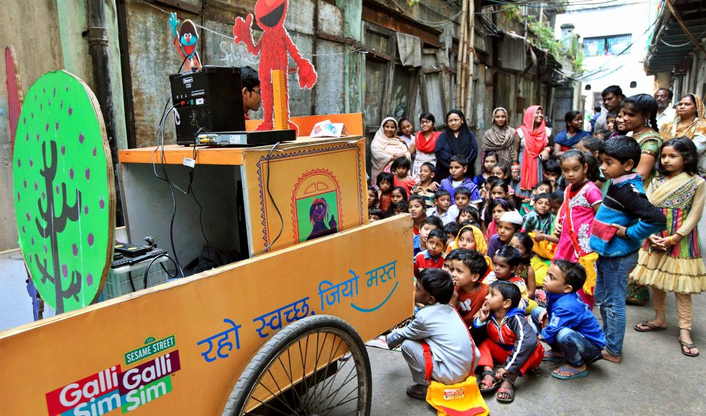 When it comes to content delivery, our commitment to meeting children where they are requires flexibility; no two distribution models are exactly the same. Sesame Street was launched using the cutting-edge technology of the time, television – and while today we use every media platform, from television to digital to mobile, sometimes the best way to reach the children who need us most requires a lower-tech approach. Whether it’s battery-operated projectors in classrooms in refugee settlements, or a repurposed vegetable cart equipped with a television and a DVD player in slums in India, we’re continually assessing the most effective platforms to reach our target audience.