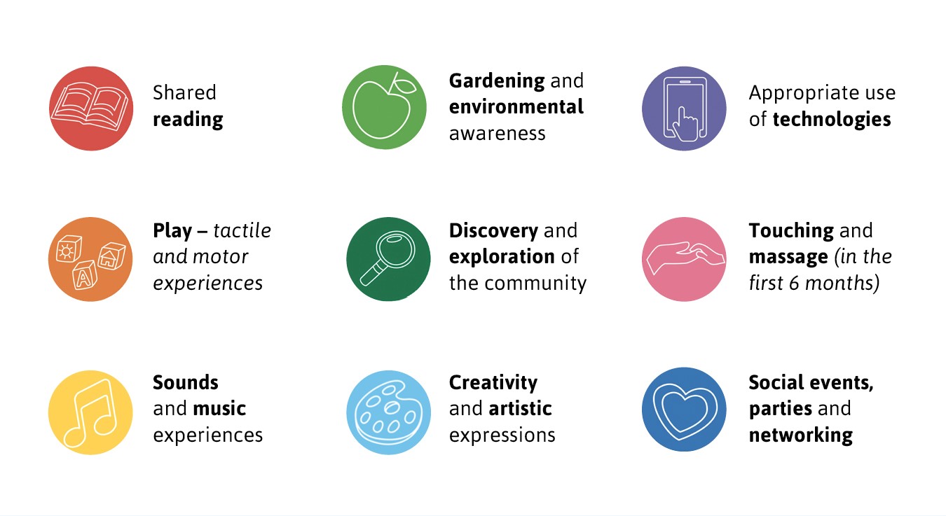 The activities offered at the Village project’s centres are meant to be easily replicable within the home environment. They were selected based on solid evidence of their impact on responsive parenting and early learning: the evidence base covers the whole sequence from the general type of intervention to its specific content, as summarised opposite. Adopting a universal, area-based approach, Village spaces are open to all families living in the communities served by the project. Together with engagement of local actors to disseminate information and contribute to activities, this facilitates the creation of new networks among families and services, nurturing shared community values, social inclusion and sustainability.
