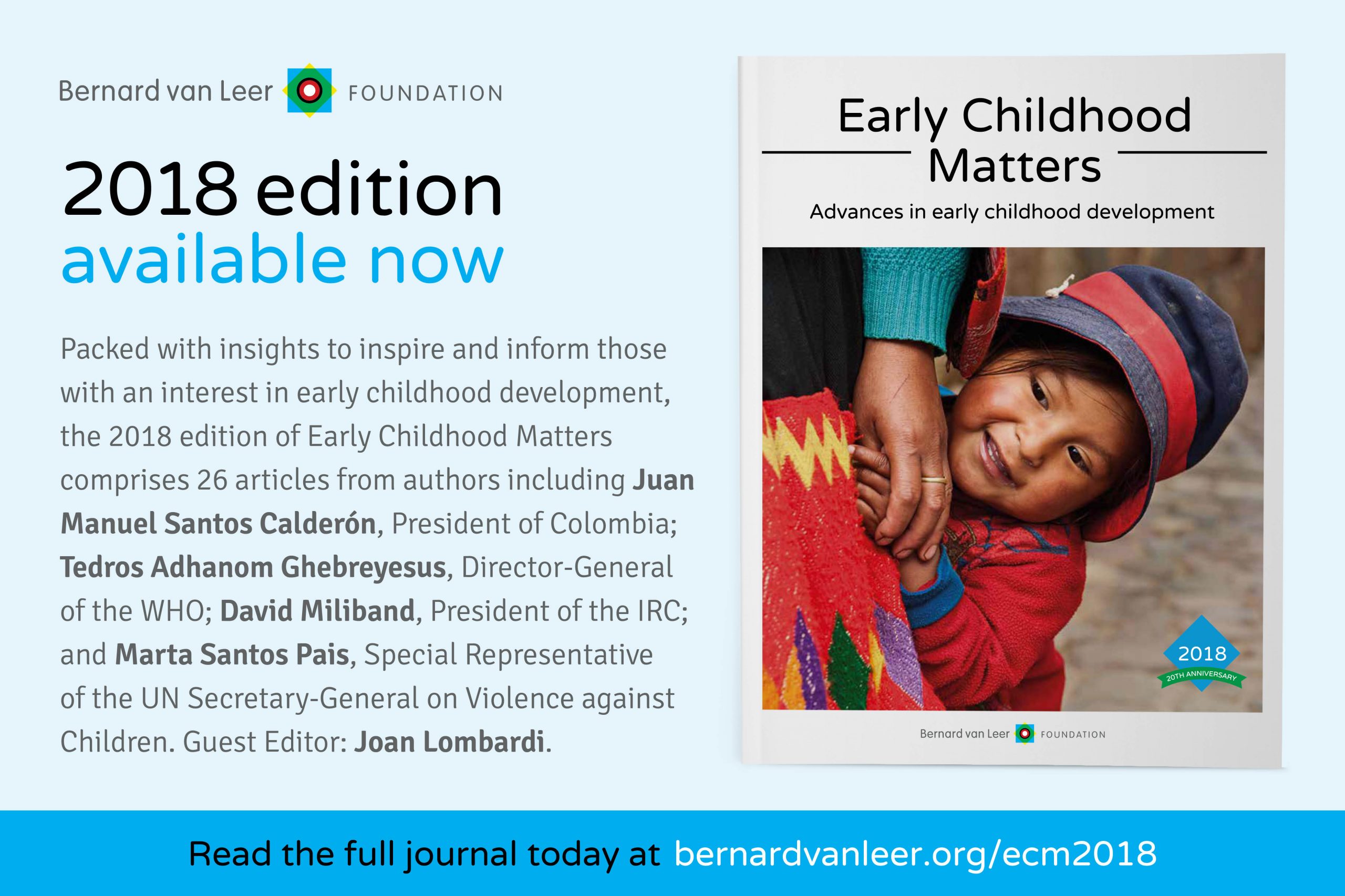 The 2018 edition of Early Childhood Matters features keynote contributions from the President of Colombia, Juan Manuel Santos Calderón, on the ‘De Cero a Siempre’ policy; Tedros Adhanom Ghebreyesus, Director-General of the WHO, on nurturing care; IRC President David W. Miliband on the humanitarian system and young children; and UN Special Representative Marta Santos Pais on violence prevention.